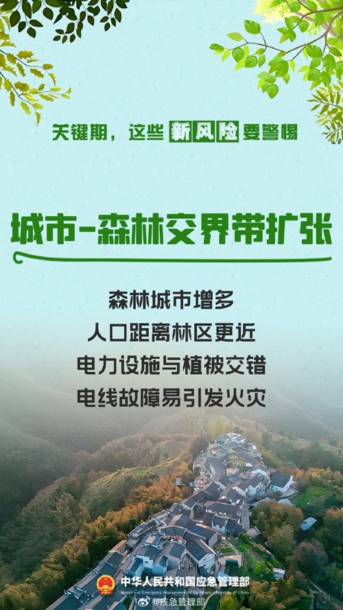 陽(yáng)春三月,春意盎然。春季氣溫逐漸升高,降水偏少,大風(fēng)天氣增多。伴隨春耕生產(chǎn)、踏青祭祀等生產(chǎn)生活用火增多,森林火災(zāi)風(fēng)險(xiǎn)增高。近期,多地陸續(xù)進(jìn)入春季森林防火關(guān)鍵期,以下新風(fēng)險(xiǎn)要警惕!