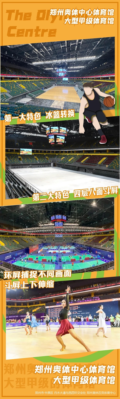 鋪上高規(guī)格的木地板結(jié)合場地正中央懸掛的四層八面斗屏,就是舉辦一場NBA比賽也是沒有問題。如果遇到大型商業(yè)活動需求時,場地空間可靈活轉(zhuǎn)換,可以根據(jù)需求布置成舞臺使用,體育館采用了地源熱泵供暖制冷系統(tǒng),相比傳統(tǒng)的中央空調(diào)節(jié)能了30%-40%。在體育館的鋼結(jié)構(gòu)頂棚施工中,采用了獨特的“跨混凝土結(jié)構(gòu)累積滑移”工藝,這項工藝榮獲了河南省工程建設科學技術獎科技創(chuàng)新特等獎。體育館作為大型甲級的場館不僅可承接一些商演等活動也可承接國際A級單項賽事和國內(nèi)綜合性運動會等。