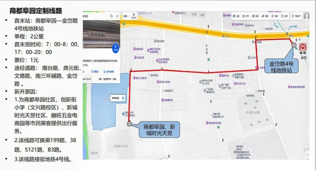 專線開通后,商都阜園項(xiàng)目租戶及業(yè)主實(shí)現(xiàn)了“出門即坐上公交,下車即地鐵口”的通勤效率新格局。線路途徑南臺路、鼎元街文德路、南三環(huán)輔路;中途包含超市、理發(fā)店、小商品城等便民商業(yè)點(diǎn)。無論是上班還是購物,都能享受到高效、舒適的出行體驗(yàn)。線路單程2公里,除直達(dá)地鐵口外也可換乘199路、38路、S121路、B3路。不僅解決了租戶的通勤難題,也為周邊社區(qū)居民提供了便利,得到了大家的一致好評。
