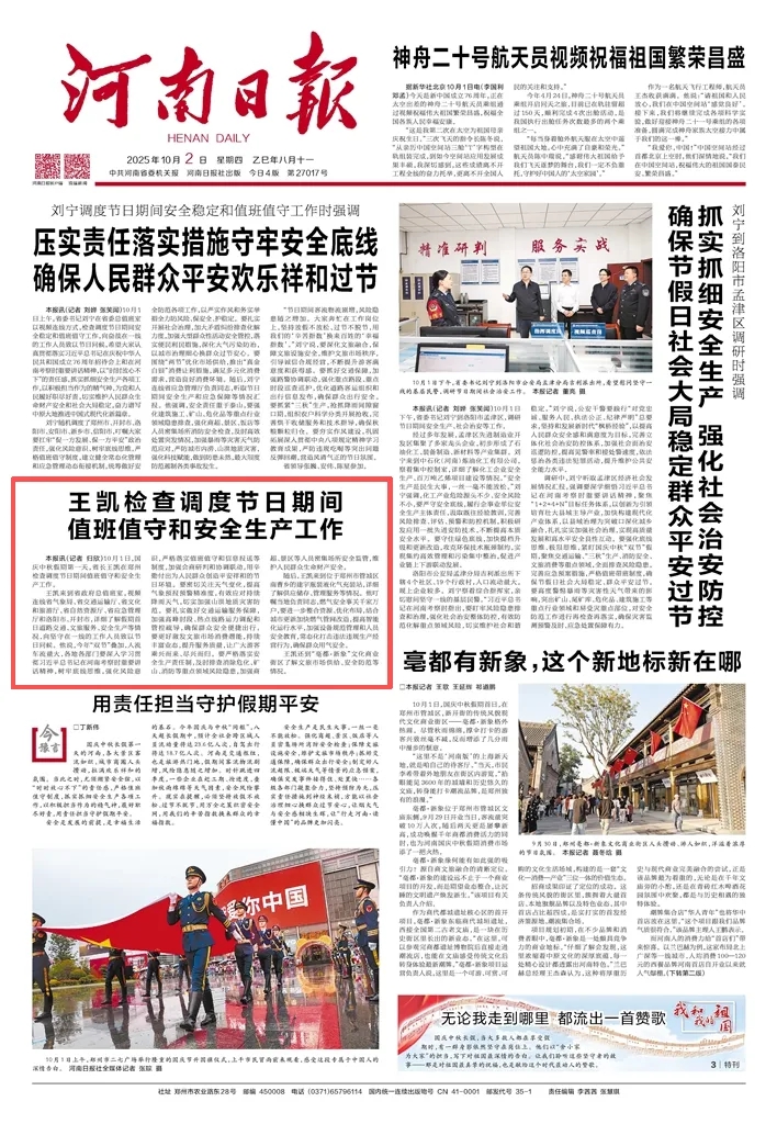 王凱來到省政府總值班室,視頻連線省氣象局、省交通運輸廳、省文化和旅游廳、省自然資源廳、省應(yīng)急管理廳和洛陽市、開封市,詳細了解假期首日道路交通、文旅服務(wù)、安全生產(chǎn)等情況,向堅守在一線的工作人員致以節(jié)日問候。他說,今年“雙節(jié)”疊加,人流車流量大,各地各部門要深入學(xué)習(xí)貫徹習(xí)近平總書記在河南考察時重要講話精神,樹牢底線思維,強化風(fēng)險意識,嚴格落實值班值守和信息報送等制度,加強會商研判和協(xié)調(diào)聯(lián)動,用辛勤付出為人民群眾創(chuàng)造平安祥和的節(jié)日環(huán)境。要密切關(guān)注天氣變化,提高氣象預(yù)報預(yù)警精準(zhǔn)度,有效應(yīng)對持續(xù)降雨天氣,切實加強山洪地質(zhì)災(zāi)害防范。要扎實做好交通運輸服務(wù)保障,加強高峰時段、熱點線路運力調(diào)配和管控疏導(dǎo),確保群眾安全便捷出行。要更好激發(fā)文旅市場消費潛能,持續(xù)豐富業(yè)態(tài),提升服務(wù)質(zhì)量,讓廣大游客乘興而來、盡興而歸。要嚴格落實安全生產(chǎn)責(zé)任制,及時排查消除?;?、礦山、消防等重點領(lǐng)域風(fēng)險隱患,加強商超、景區(qū)等人員密集場所安全監(jiān)管,維護人民群眾生命財產(chǎn)安全。